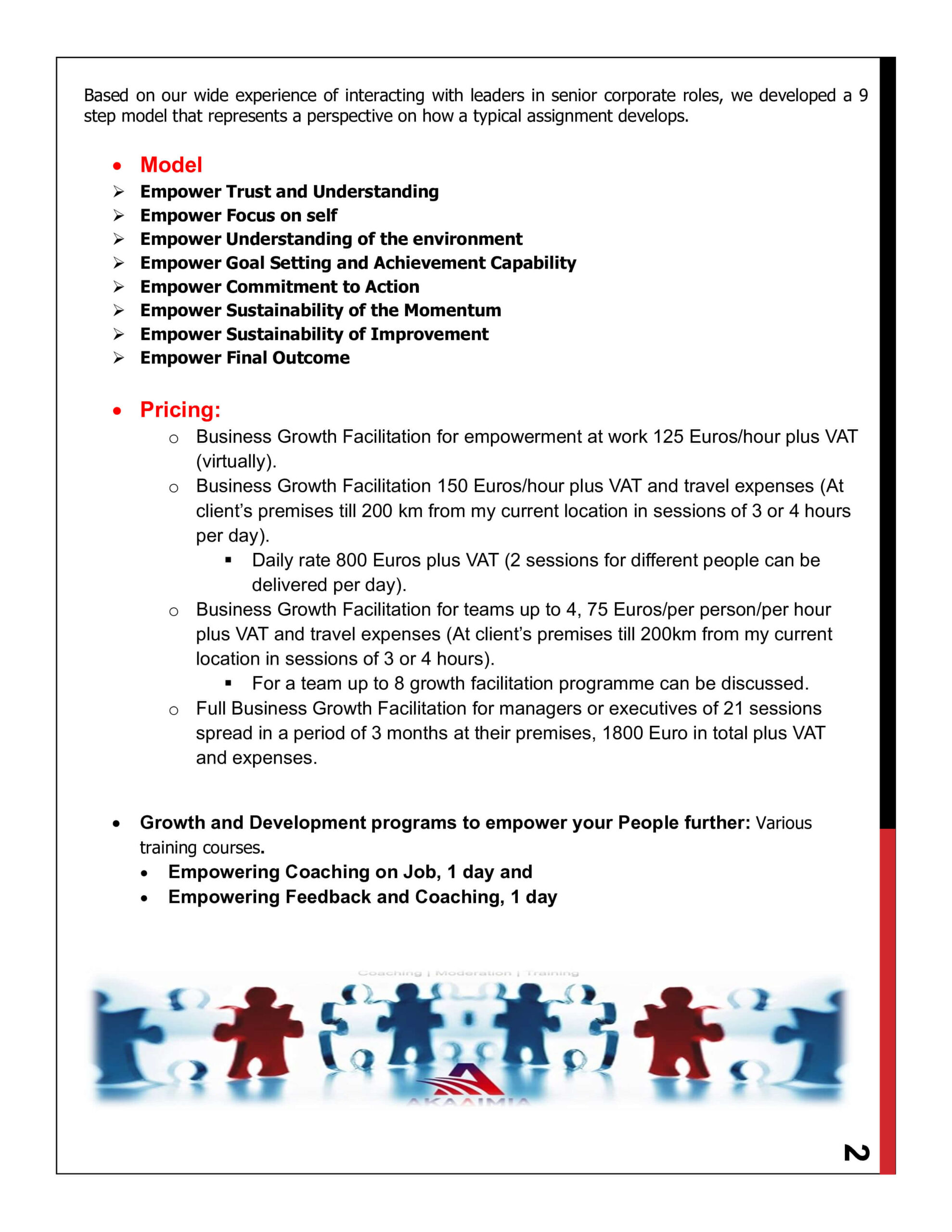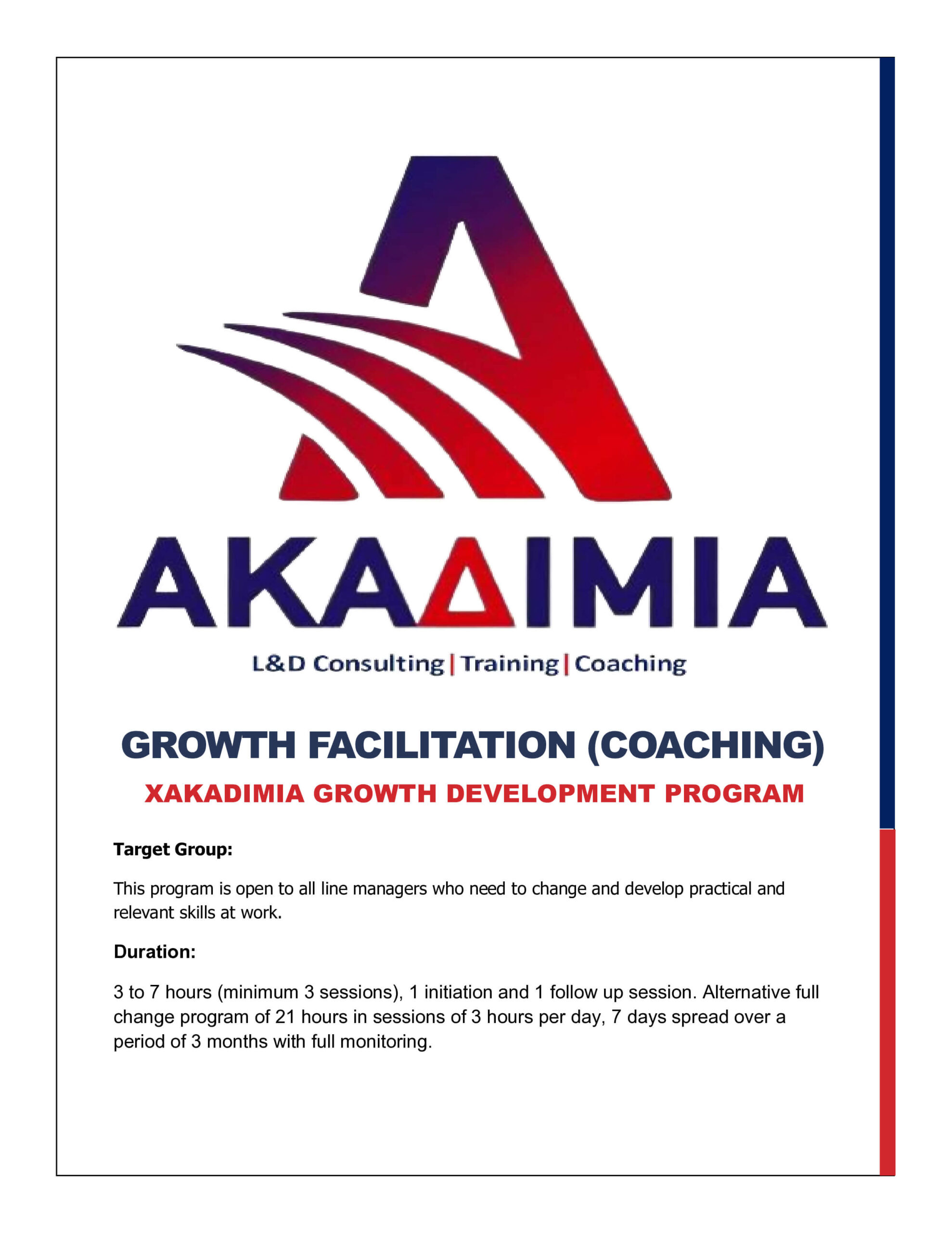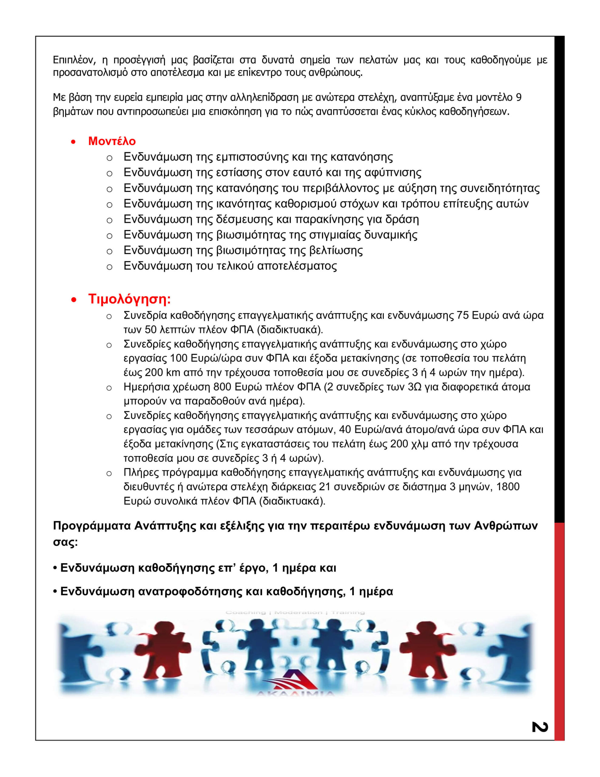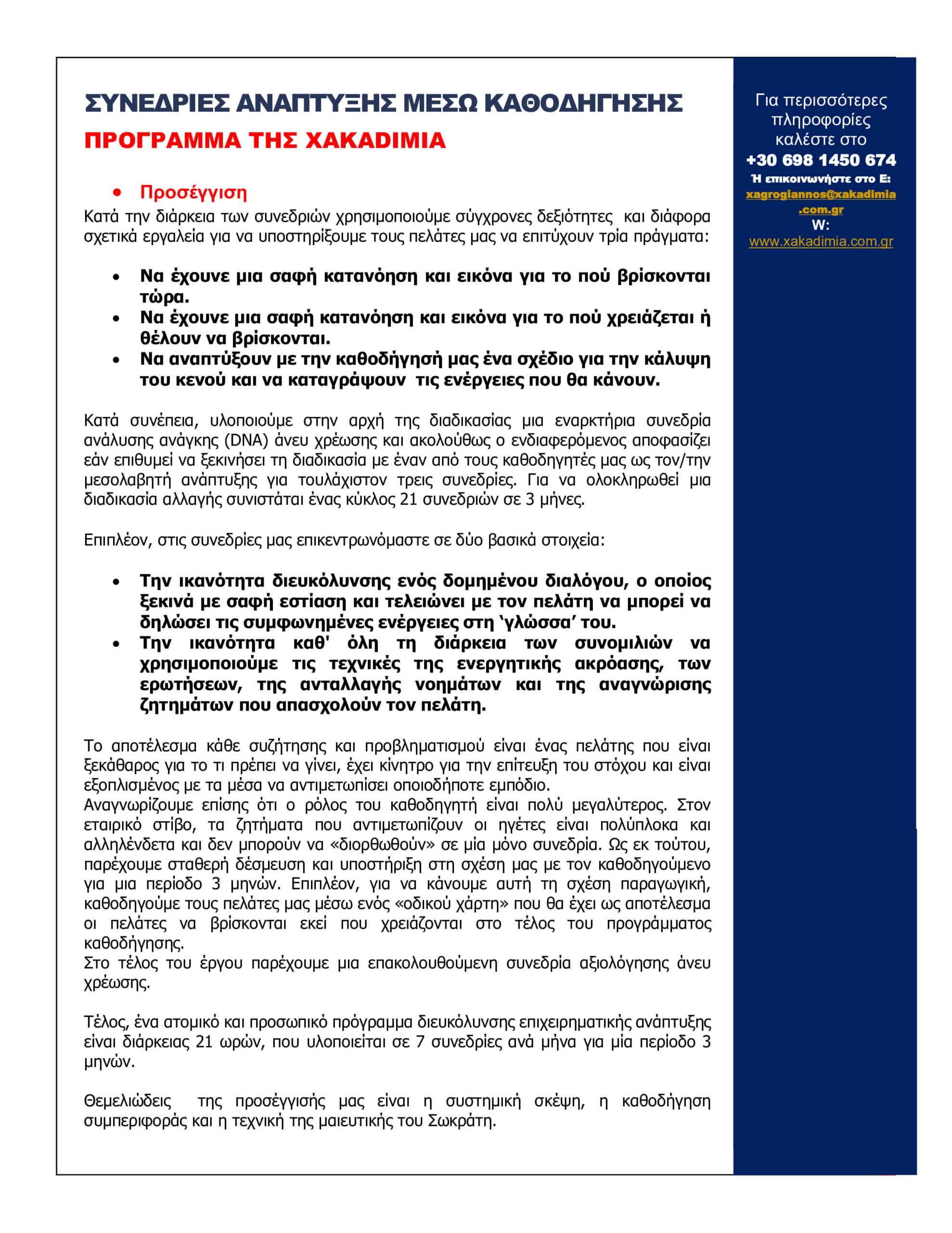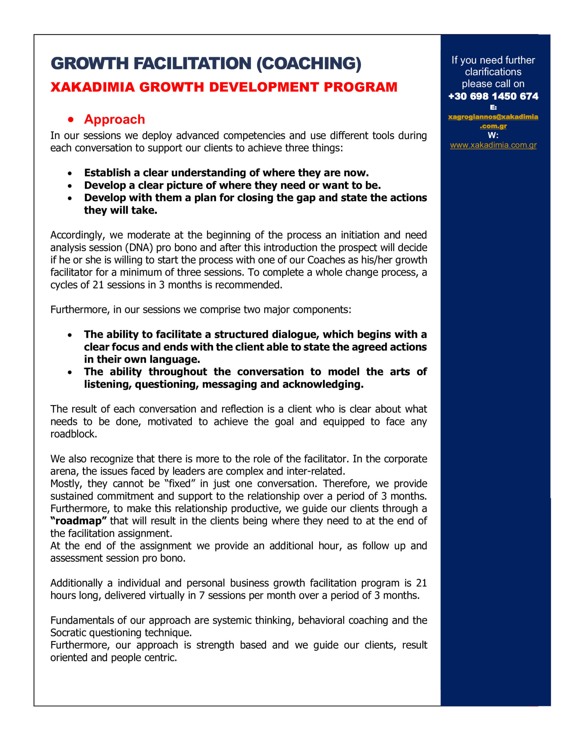 Μια ολιστική προσέγγιση στις ανάγκες ανάπτυξης τόσο στη ζωή σας, όσο και στην εργασίας σας. Το πρόγραμμα θα επιταχύνει τη δική σας προσωπική ανάπτυξη και εξέλιξη. Θα συντονισθεί η ακόλουθη προσέγγιση: